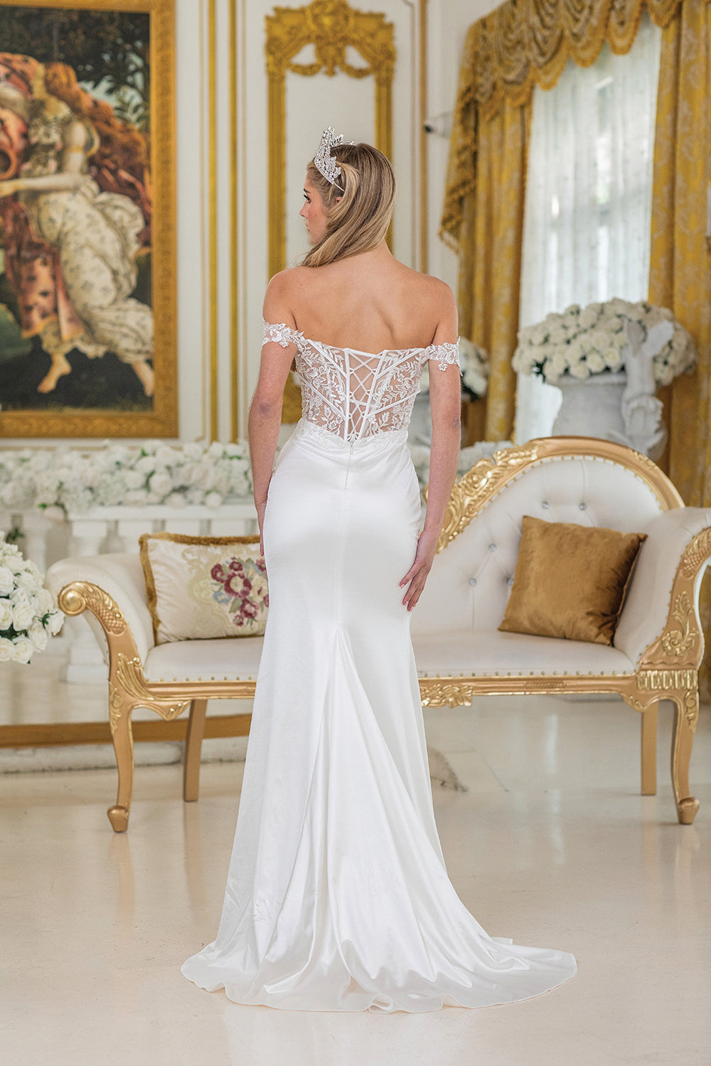 Off-Shoulder Satin Wedding Dress with Sheer Corset Bodice, Lace Embellishments, High Slit, and Fitted Silhouette