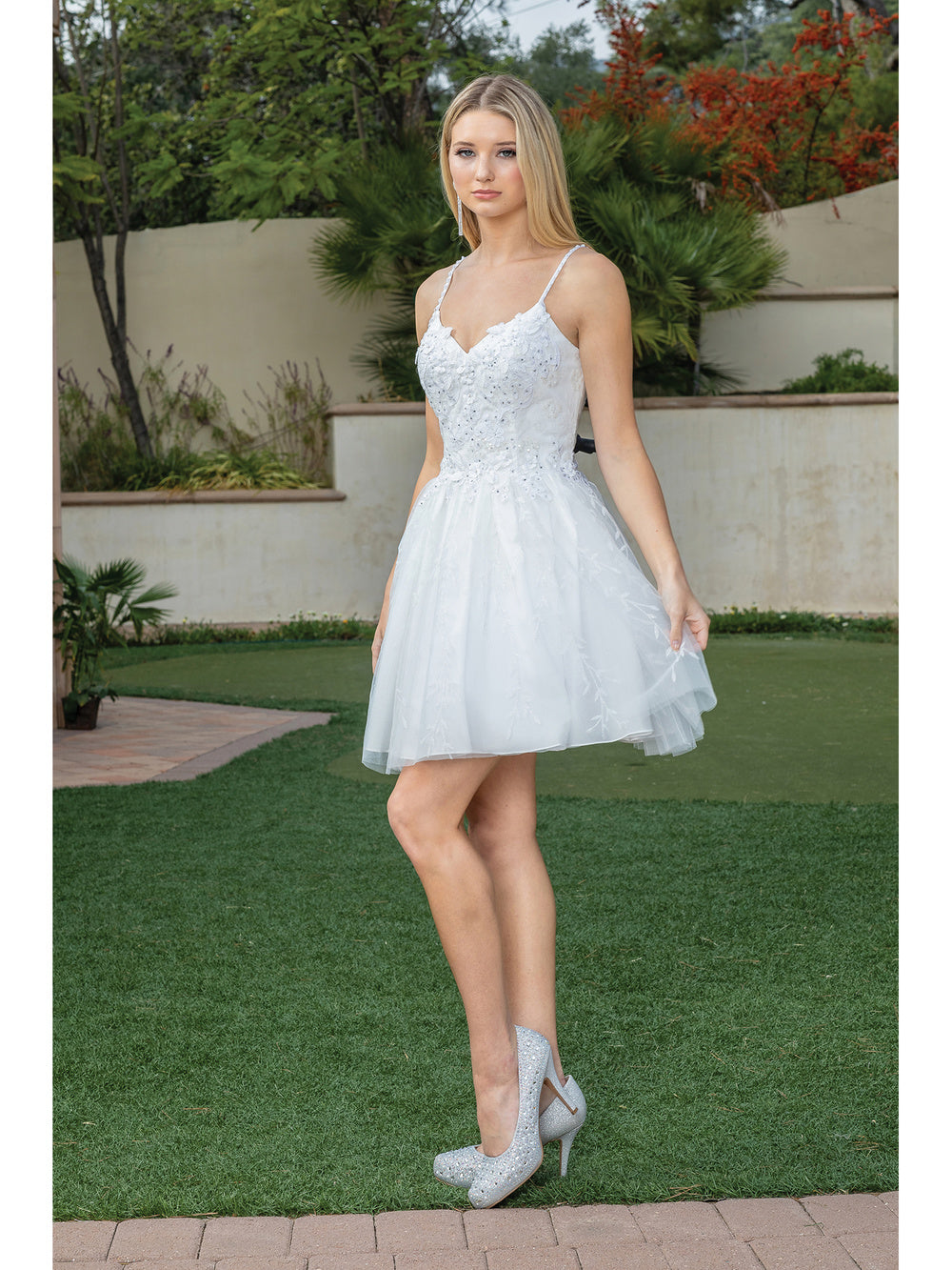 Exude a charm that is meant to mesmerize the elite crowd in this gorgeously decadent Dancing Queen 3278 creation. Fascinatingly adorned with a floral embroidery and beads accent, the dress showcases a sleeveless, sweetheart neckline and spaghetti straps. The back reveals a mid-open V-back detail and has a center zipper closure. The skirt flares into a dramatic A-line silhouette in a short hemline. Make your perfect day blossom with a promise of forever in this Dancing Queen masterpiece. Models are wearing the Bahama Blue, Black, Champagne, Off White, Rose Gold and Royal Blue colors.