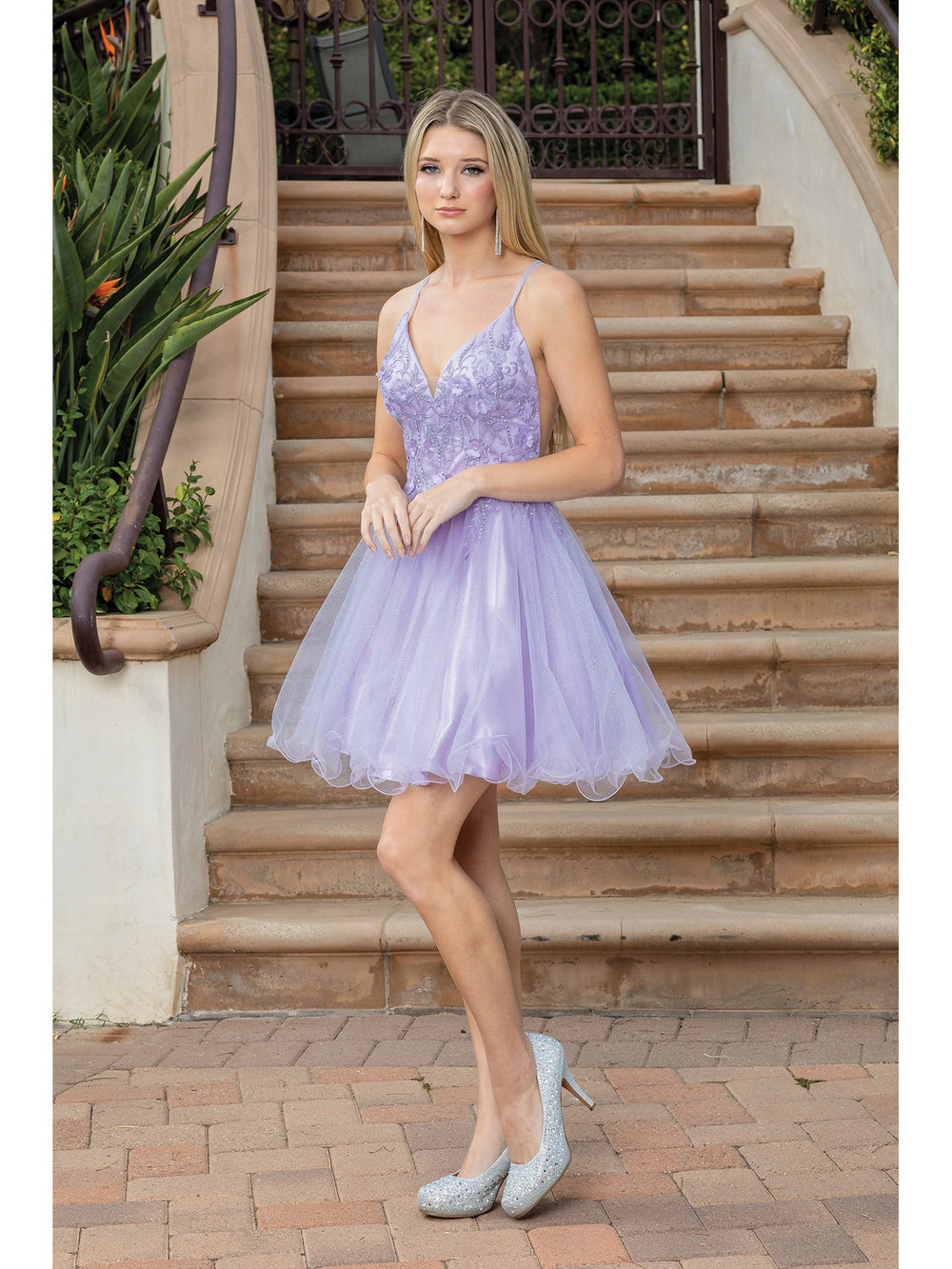 Flatter that exquisite figure with pure beauty in this Dancing Queen 3316 creation. Beautifully ornamented with lace appliques of florals and foliates, this stunner crafts a deep v-neckline with a sheer inset. Hanging from spaghetti straps while trailing into a lace up detail down its sheer ornate back, the tulle skirt fascinatingly flares into a mini rolled hemline. Get primed to climb that social ladder as you captivate the crowd in this Dancing Queen masterpiece. models are wearing the Bahama Blue and Lilac colors.