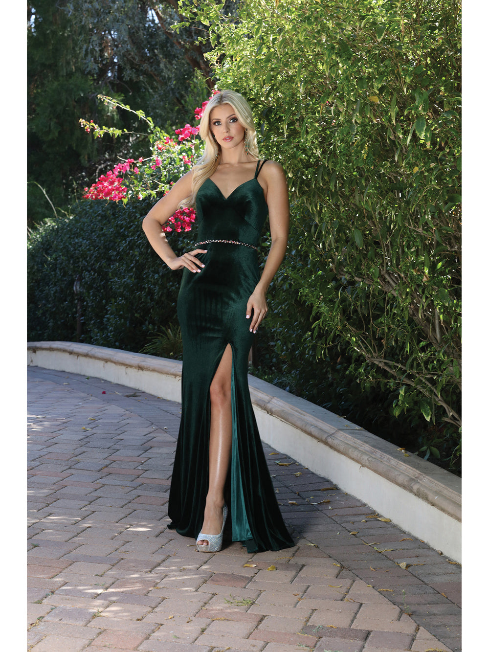 Make everyone fall for the classic beauty of this Dancing Queen 4102 creation. Defined with a rich velvet silhouette, this stunner shows a deep v-neckline with double spaghetti straps. Contoured with a peaked empire design, the waist is adorned with a jeweled band. The sheath skirt glides along the hips and parts with a high slit. A sweeping train completes this ensemble. Lavish in the timeless style of this Dancing Queen masterpiece.
