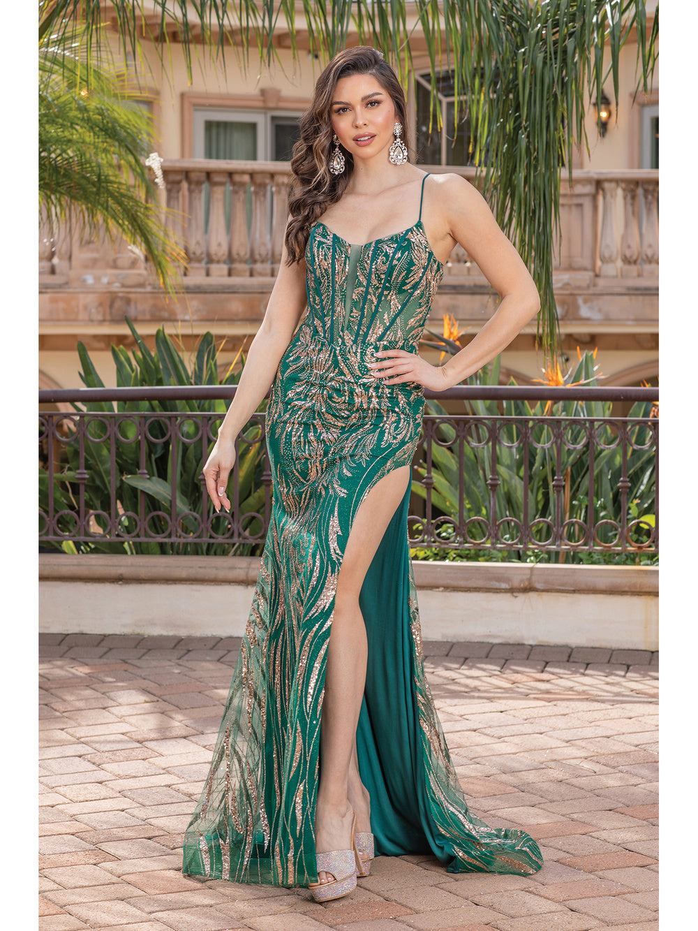 Expect to be turning heads as you walk into your special event wearing this creatively romantic Dancing Queen 4334. The gown is designed completely with sparkling ornamental patterns that will get you noticed in any crowd. The bodice has a scoop neckline, spaghetti straps, and an adjustable criss-cross lace work at the back. The visible boning in the bodice is brilliant for creating a smaller upper body and perfect for giving structure as well. The floor-length skirt falls to the floor with a seductive side high slit and cascades more in a sweep train. Charm everyone from all angles as you shine all night long in this Dancing Queen 4334 masterpiece. Models are wearing Gold, Hunter Green and Royal Blue colors.