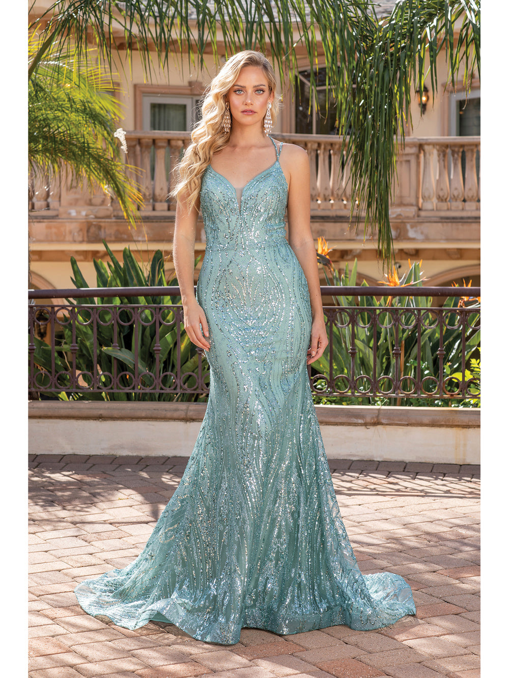 Sparkle in beauty wearing this Dancing Queen 4081. Bloom in beauty with the dress that is embellished with embroidered flowers and crystal beaded band. Plunging V neckline is matched with a mid back cut on a fitted bodice of a trumpet evening dress that has metallic shine effect. Breeze through your special day while making a stylish statement in this Dancing Queen masterpiece.