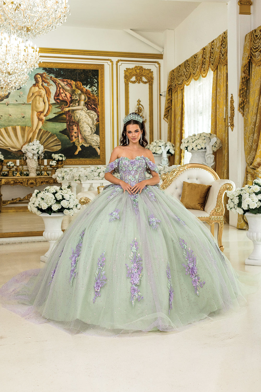 Quinceanera Dress with Off-Shoulder Floral Appliques, Corset Bodice, Glittered Tulle Skirt, and Delicate Layered Detailing