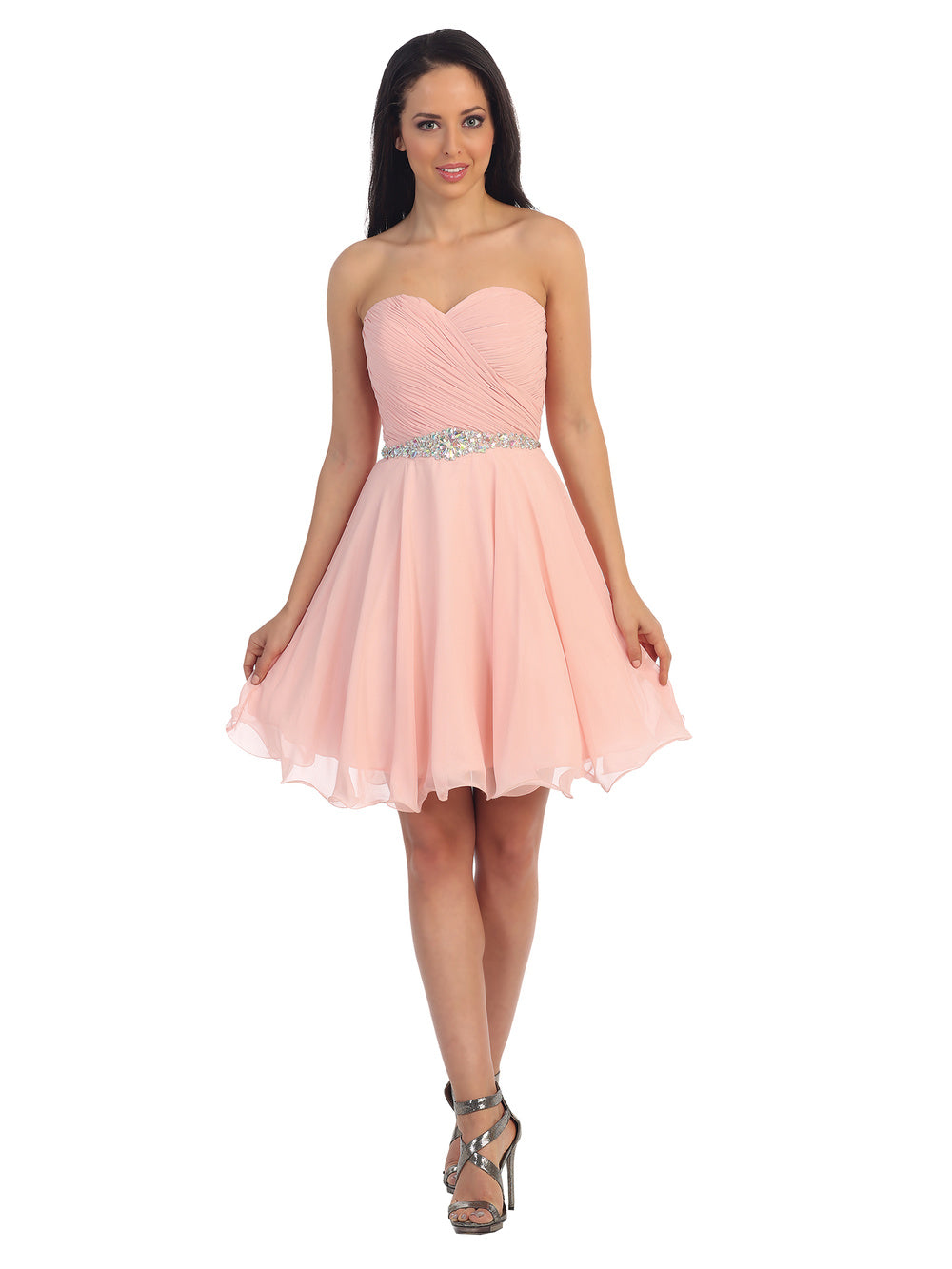 Exude a fascinatingly beautiful flair in this charming creation. The strapless sweetheart bodice is elegantly ruched to the natural waist and is adorned with crystal stones encrusted belt for a sophisticated touch. This figure-flattering ensemble flutters to the mid-thigh hem in glamorous waves. This stunning masterpiece brings together all the essentials for a great look at prom or party!