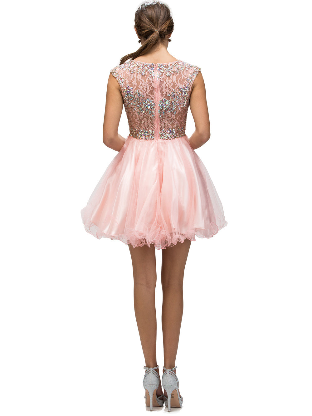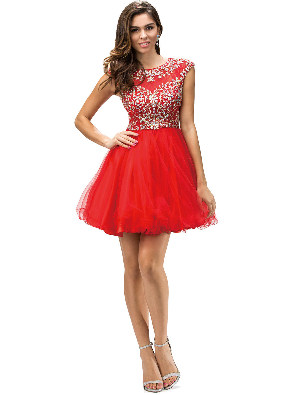 Bring out that glamour with a touch glitz to your look for prom or party. This alluring bateau neck short party dress has a sheer illusion lace bodice, luxuriously embellished with sparkling jewels in floral pattern. The short A-line skirt is layered with mesh tulle and the rolled hem gives this cap sleeve party dress a bouncy look. You'll sure to be the center of attention in this gown as you dance in this dress on that exciting night!