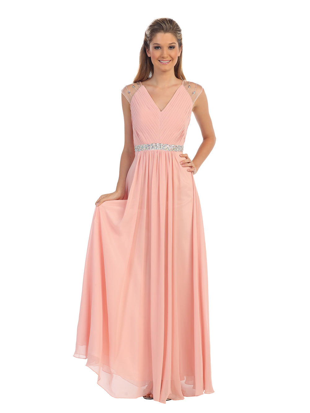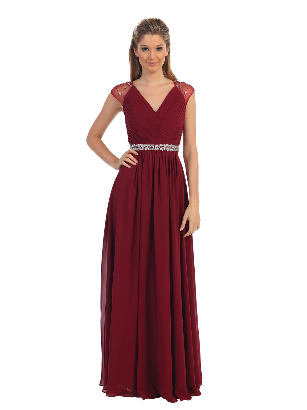 This attractive cap-sleeve prom dress has an elegant look that sparkles to make you feel like a princess. A long V-neck dress with a pleated bodice, internal bra cups and detailed with shimmering iridescent jewels to give you a remarkable shape. The V-back is complete with an invisible full-length zipper and a full-length layered chiffon skirt that boasts a dazzling crystal jewel-embellished waistband. This long prom gown make a pretty picture for prom, junior prom or any formal event.