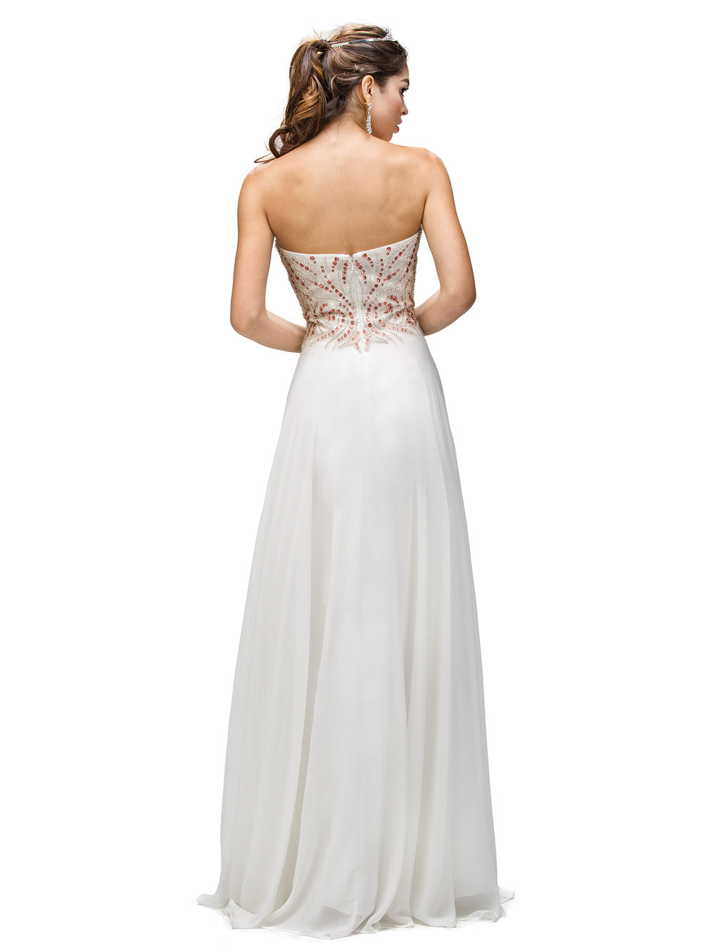 Strapless, Sweetheart neckline, Sheer fabric, Detailed beadwork, Mid-open back, Full length hem