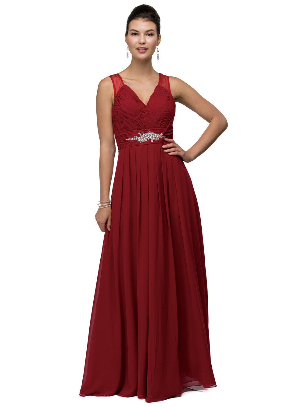You'll want to wear this long V-neck formal dress time and again for all of your special occasions. Sheer mesh forms the sleeveless shoulder straps and illusion back on this empire-waist ruched dress. The lovely chiffon skirt is pleated in front for added fullness. Figure-flattering ruching adorns the V-neck bodice and jeweled empire waist. You'll be filling your social calendar with special events from galas to military balls just to wear this stunning V-neck long formal dress more than once.