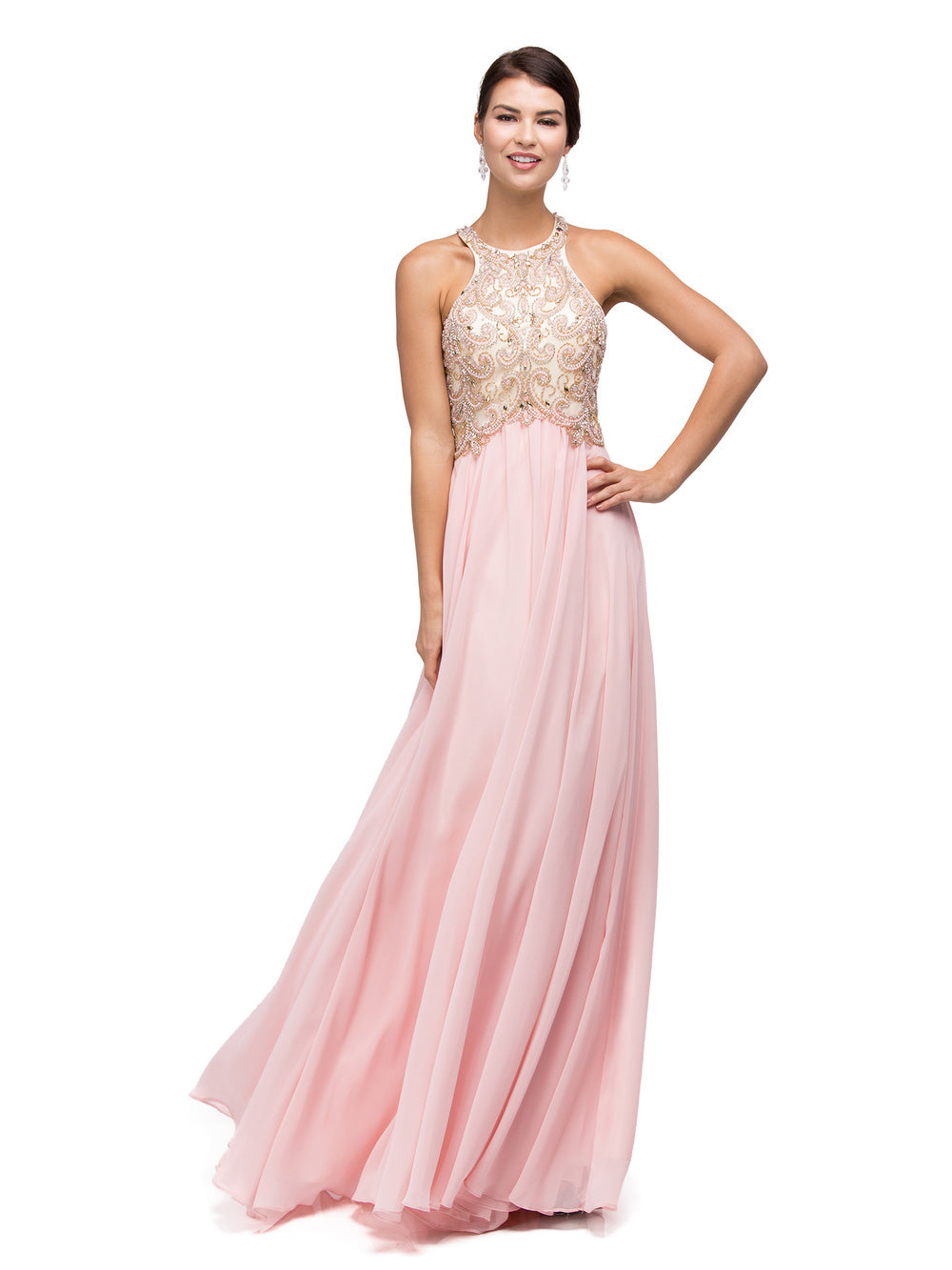100% Polyester, Chiffon, Rhinestones, Beaded, Illusion details, Bra Cups, Sleeveless, A-line skirt, Racer back