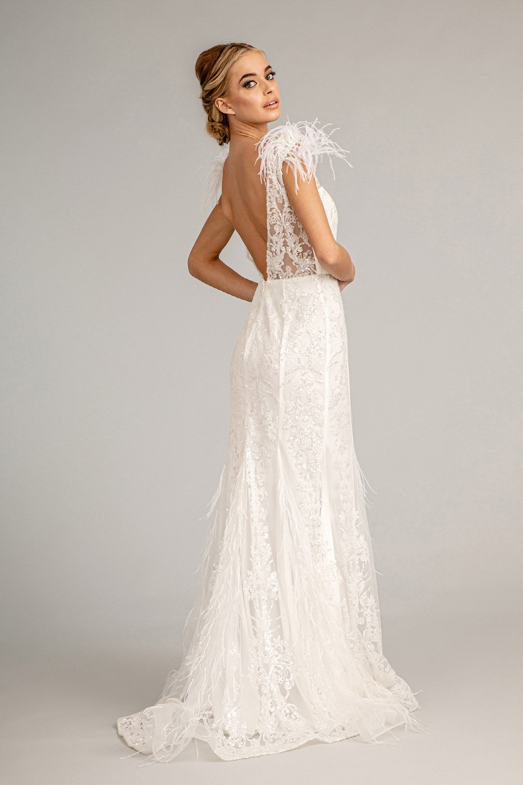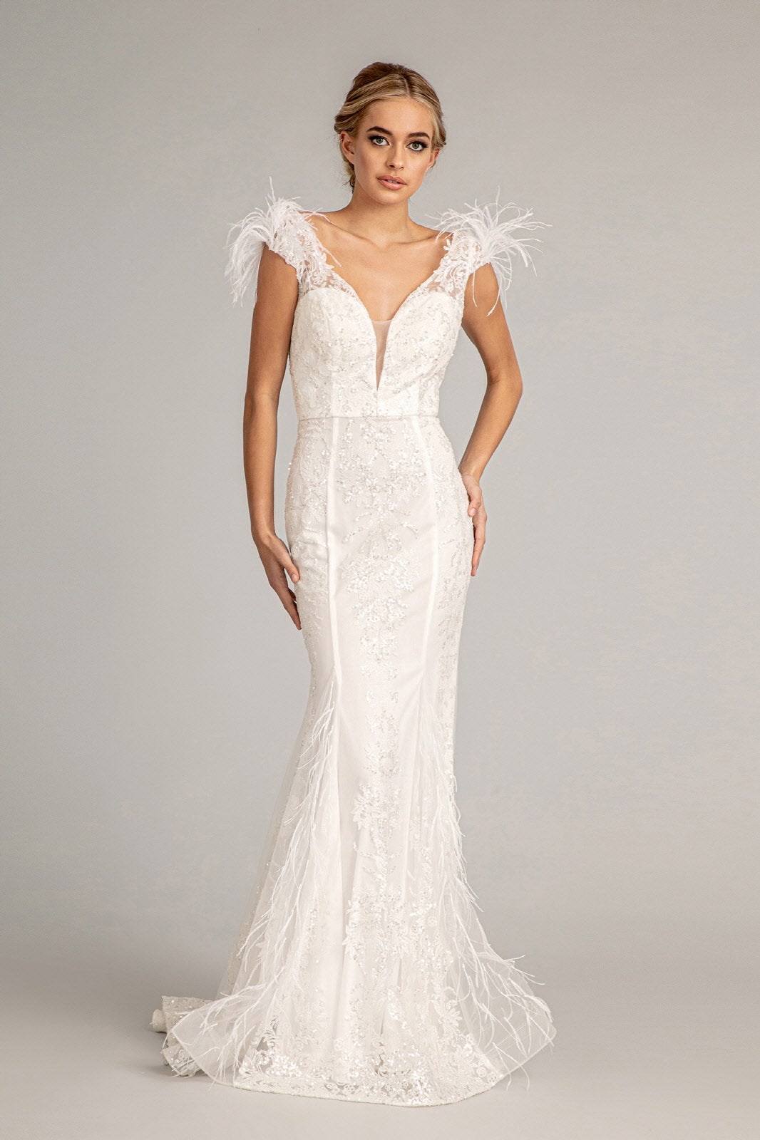 Feather Embellished Sleeveless Glitter Mesh Prom Dress w/ Sheer Back