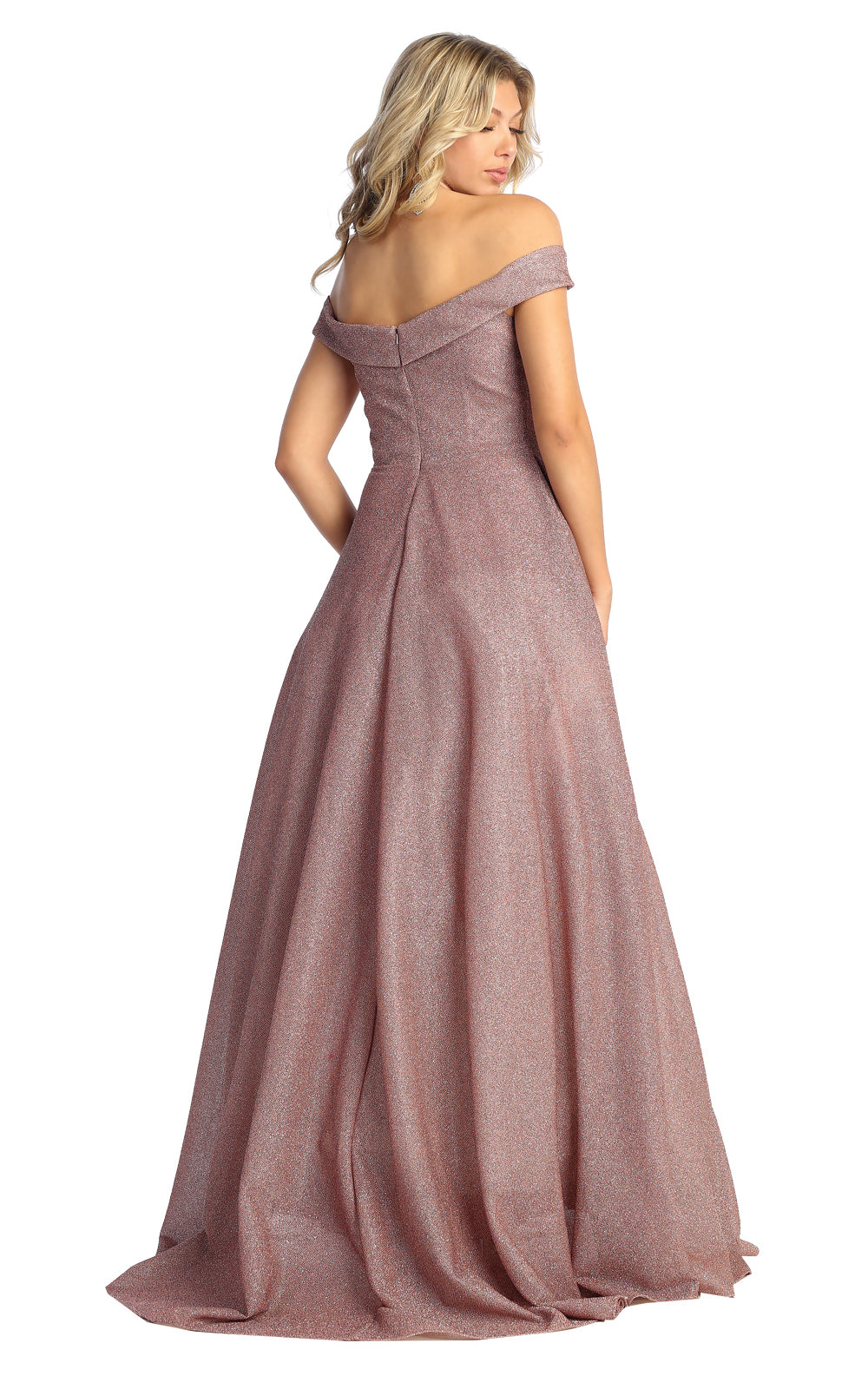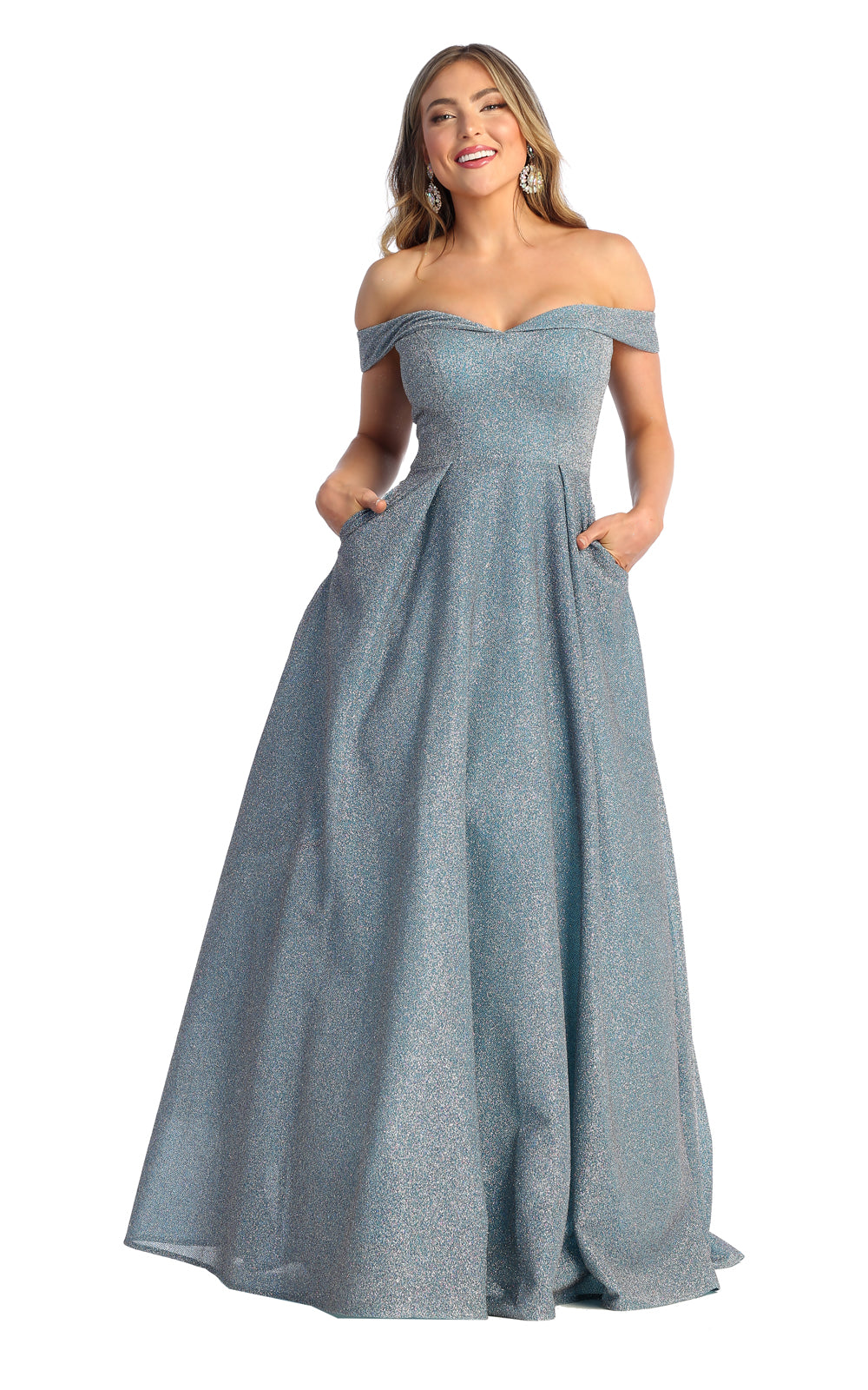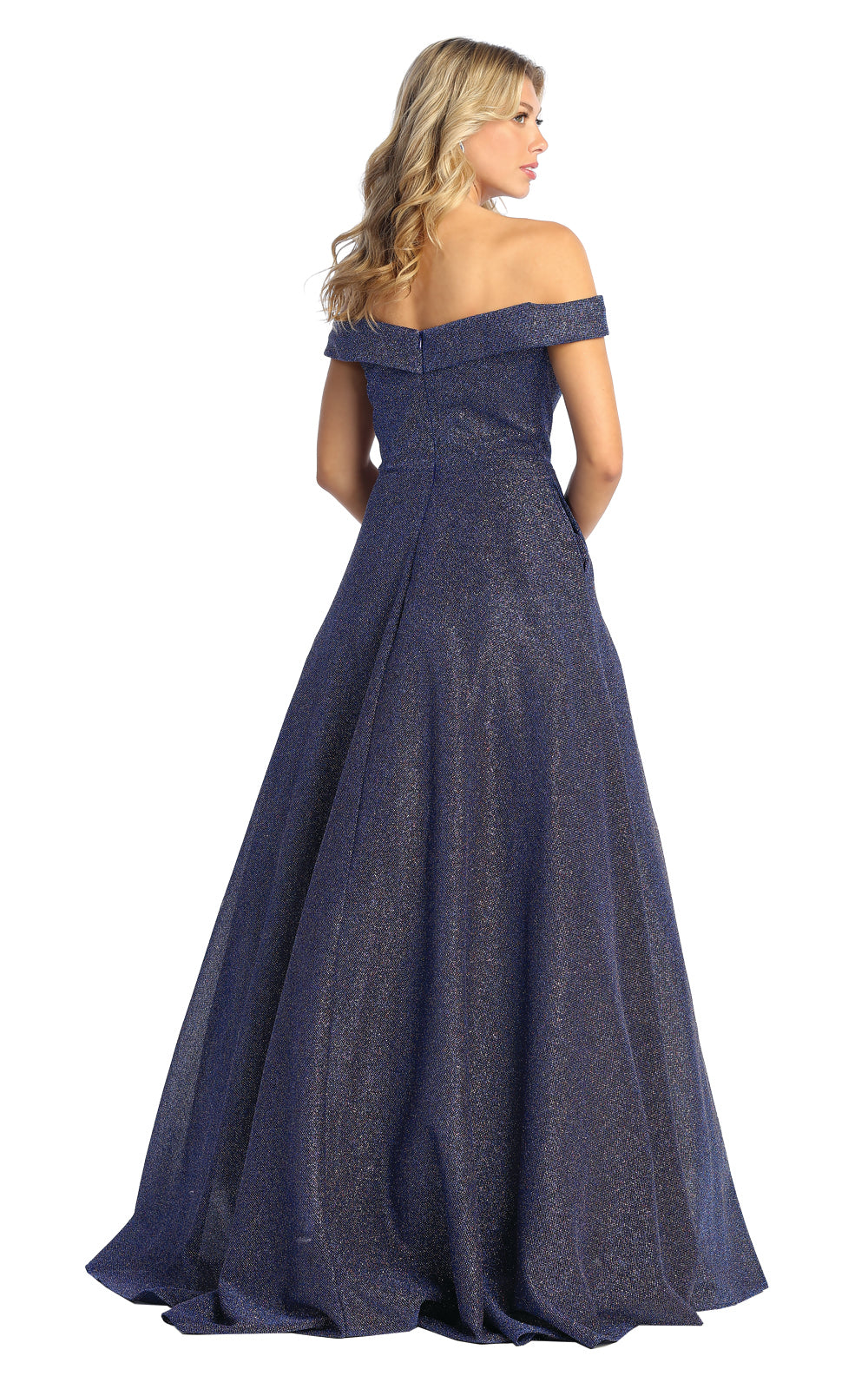 Embrace a classic sense of style in this engaging May Queen MQ1915 ensemble. This absolutely stunning gown is textured in glitters that provide an impeccable shine. It has an off-shoulder sweetheart neckline with foldover detailing and a mid-open back with a center zipper. The skirt flaunts an A-line silhouette that strikingly descends to the full-length hem and sweeping train. The night is yours in a spectacular gown from May Queen MQ1915.