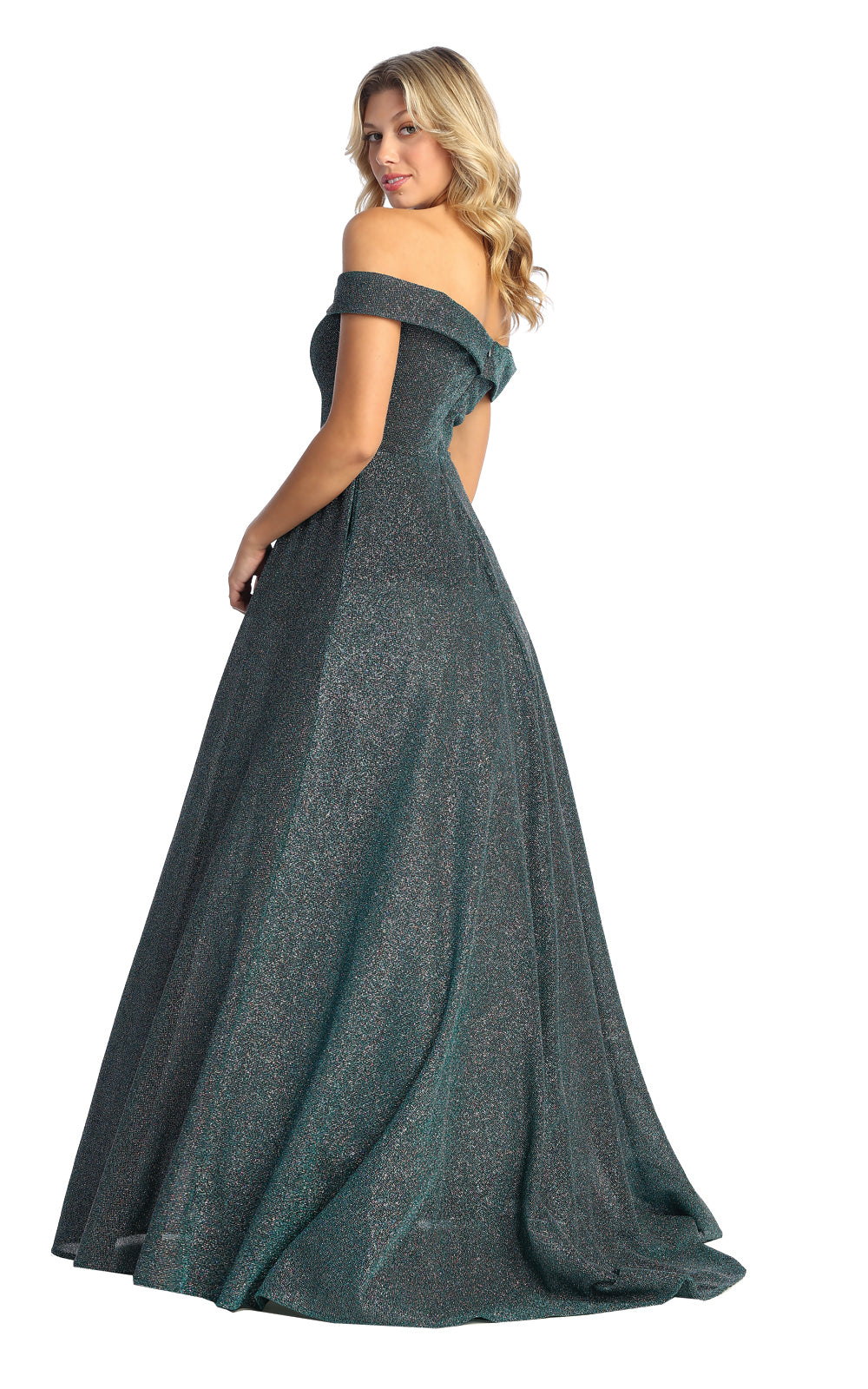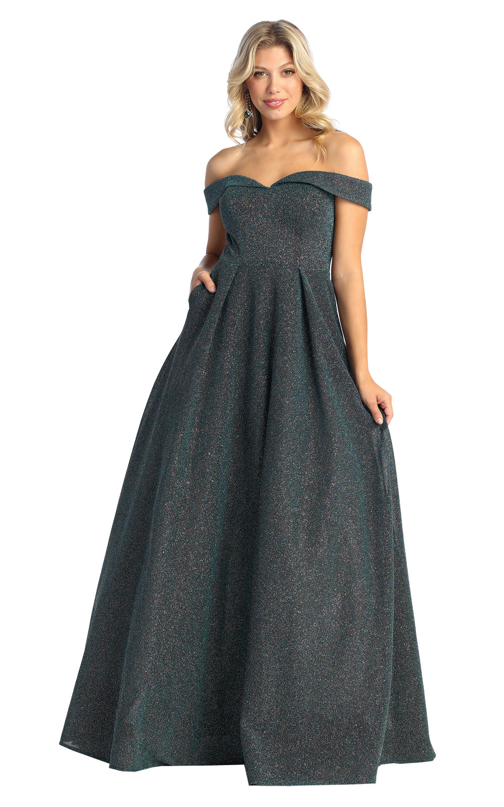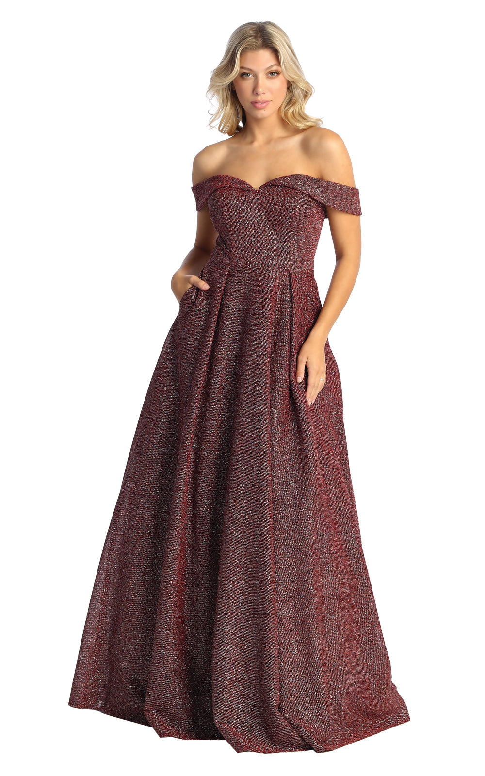 Embrace a classic sense of style in this engaging May Queen MQ1915 ensemble. This absolutely stunning gown is textured in glitters that provide an impeccable shine. It has an off-shoulder sweetheart neckline with foldover detailing and a mid-open back with a center zipper. The skirt flaunts an A-line silhouette that strikingly descends to the full-length hem and sweeping train. The night is yours in a spectacular gown from May Queen MQ1915.