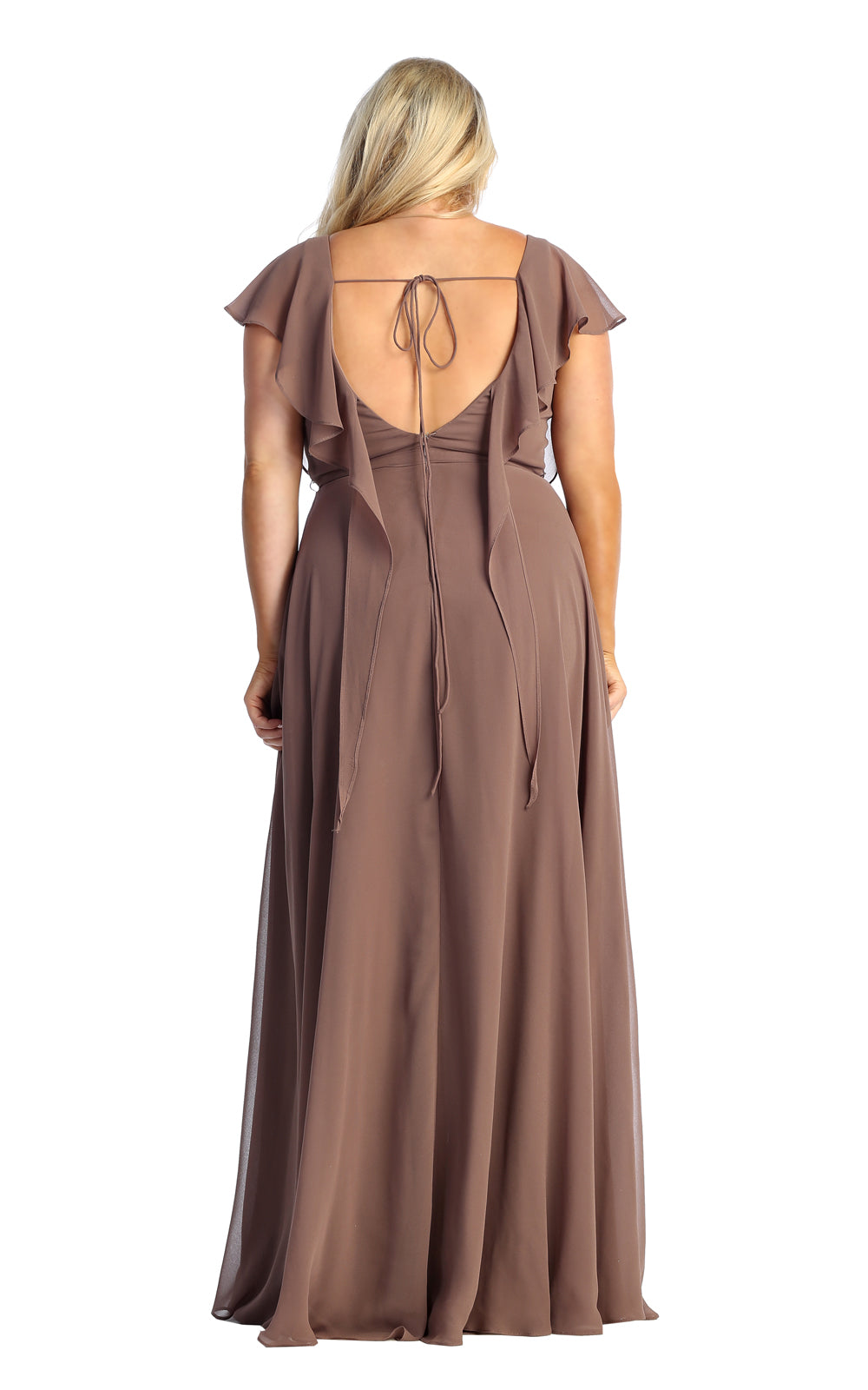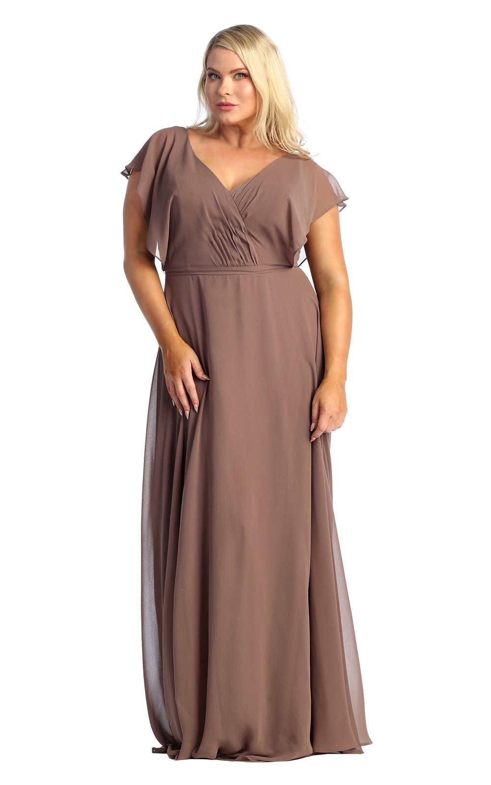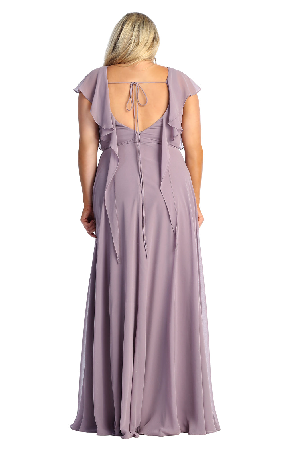 | Details: | Flutter Sleeve, Surplice Pleated Bodice, Scoop Back, Tie Strap, Back Zipper |