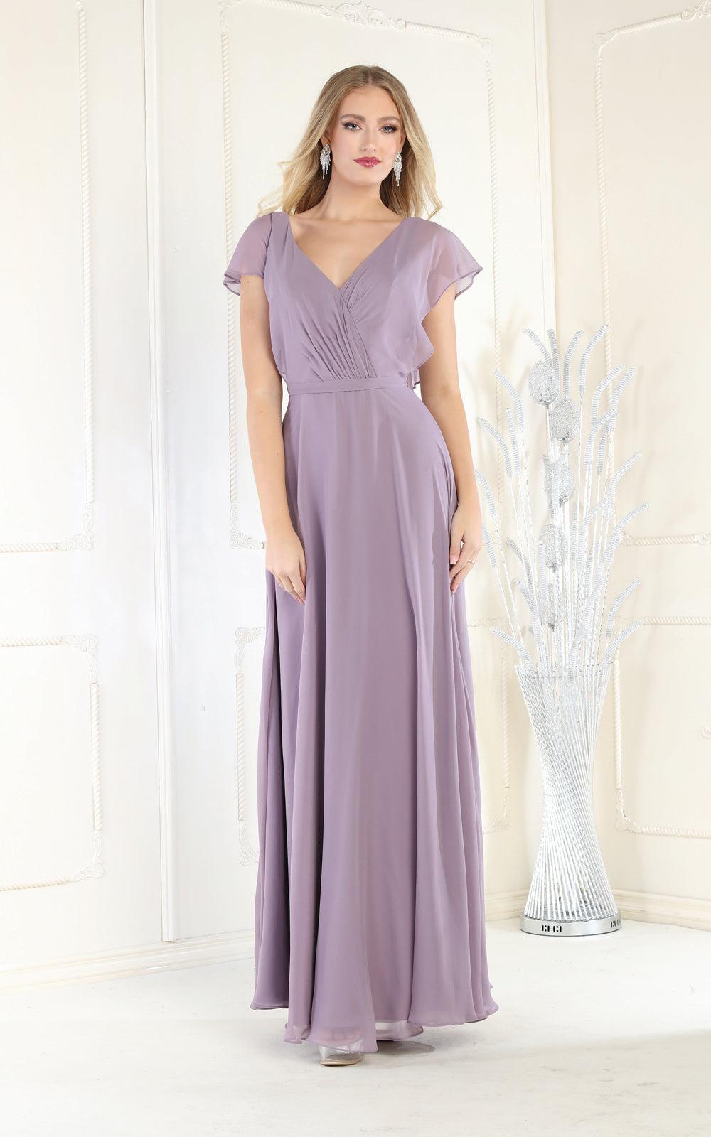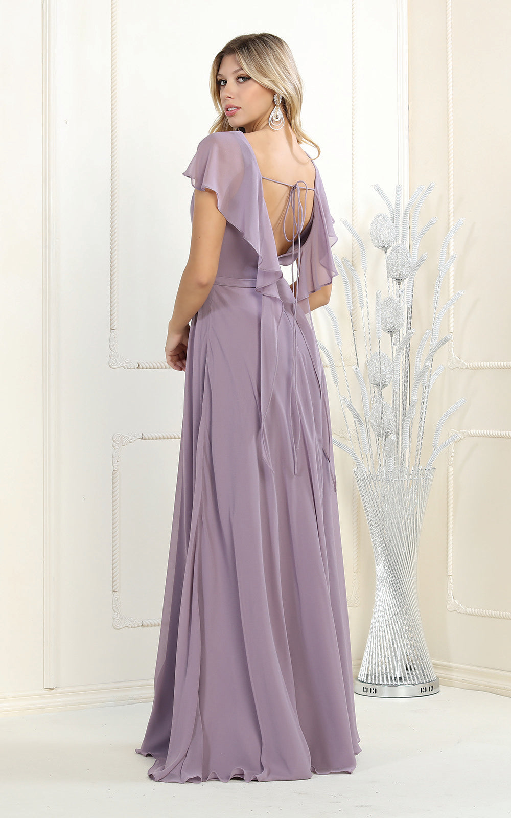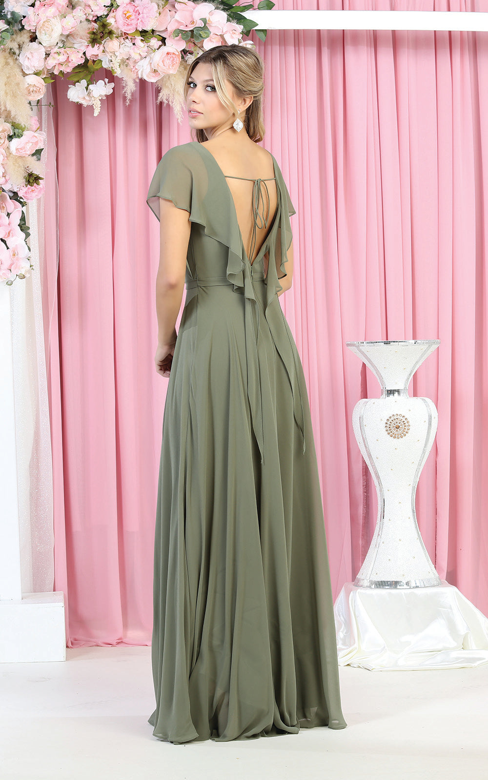 All eyes will be on you in this elegant May Queen MQ1917 creation. This fashionable gown features a surplice pleated bodice with a v-neckline and flutter sleeves. Styled with a low scoop back and a tie strap, the skirt creates an A-line silhouette flowing to the full-length hem. You'll look fantastic in photos with a beautiful long gown from May Queen MQ1917.
