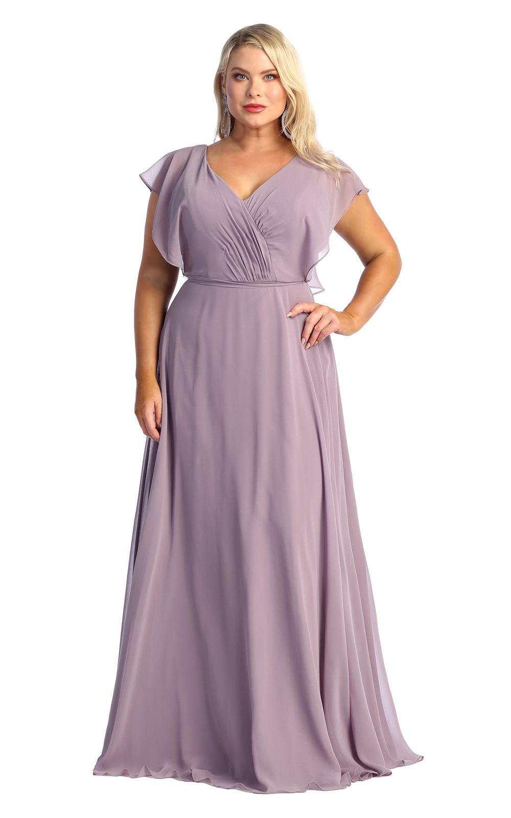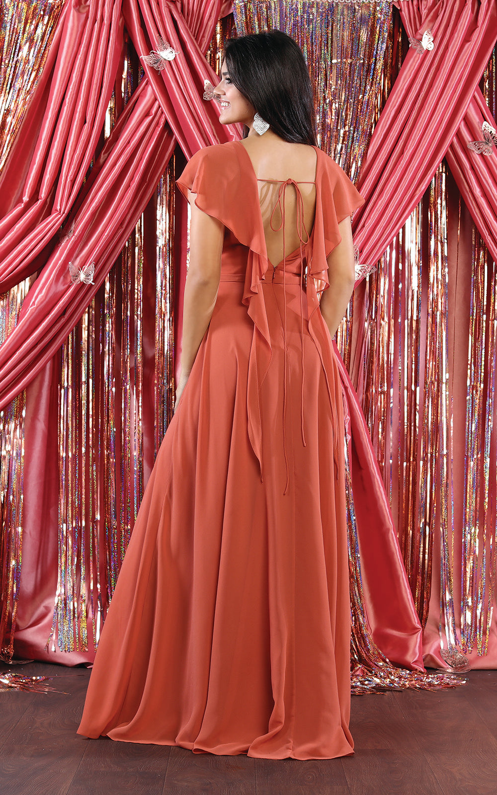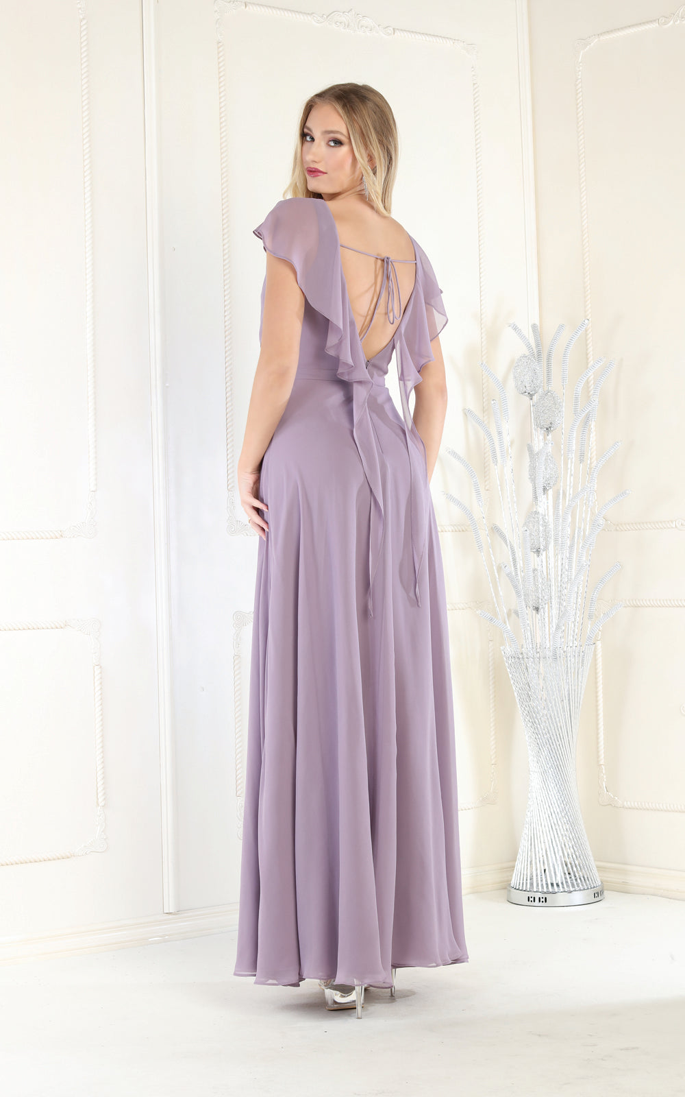 All eyes will be on you in this elegant May Queen MQ1917 creation. This fashionable gown features a surplice pleated bodice with a v-neckline and flutter sleeves. Styled with a low scoop back and a tie strap, the skirt creates an A-line silhouette flowing to the full-length hem. You'll look fantastic in photos with a beautiful long gown from May Queen MQ1917.