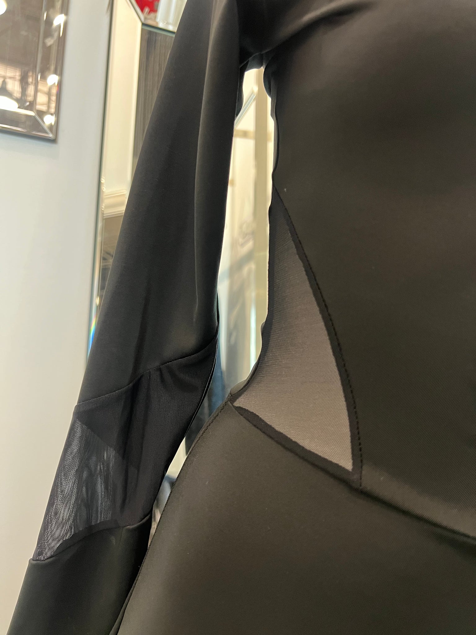Long sleeve jumpsuit, sculpting compression, breathable mesh panels for a contouring fit.