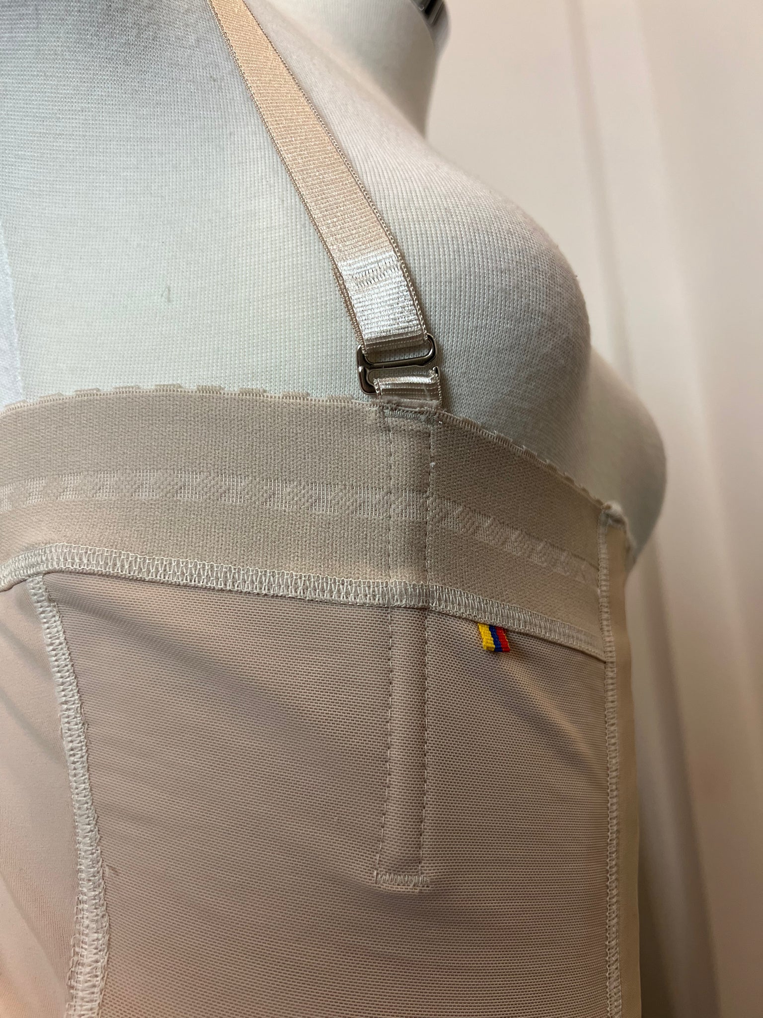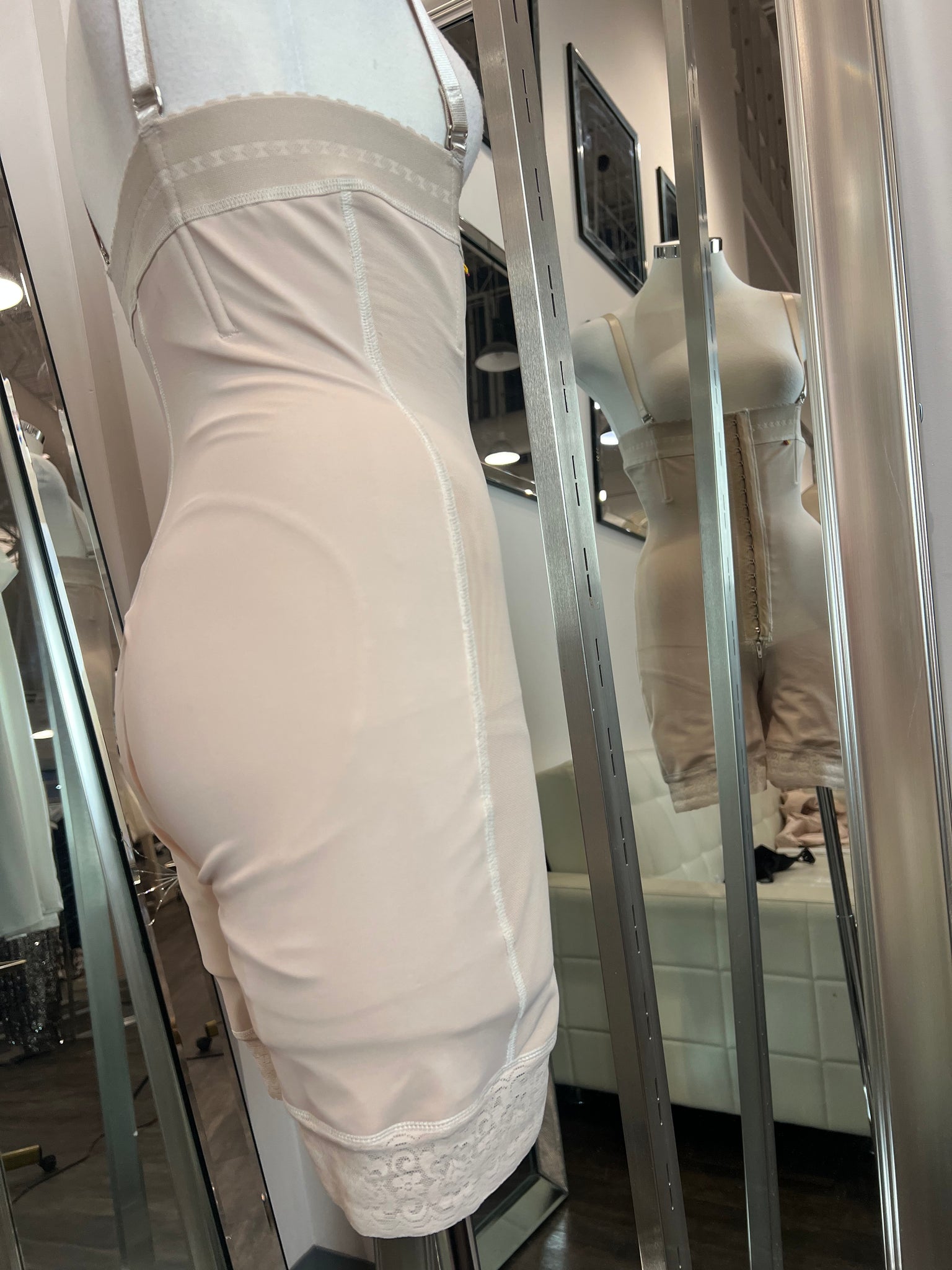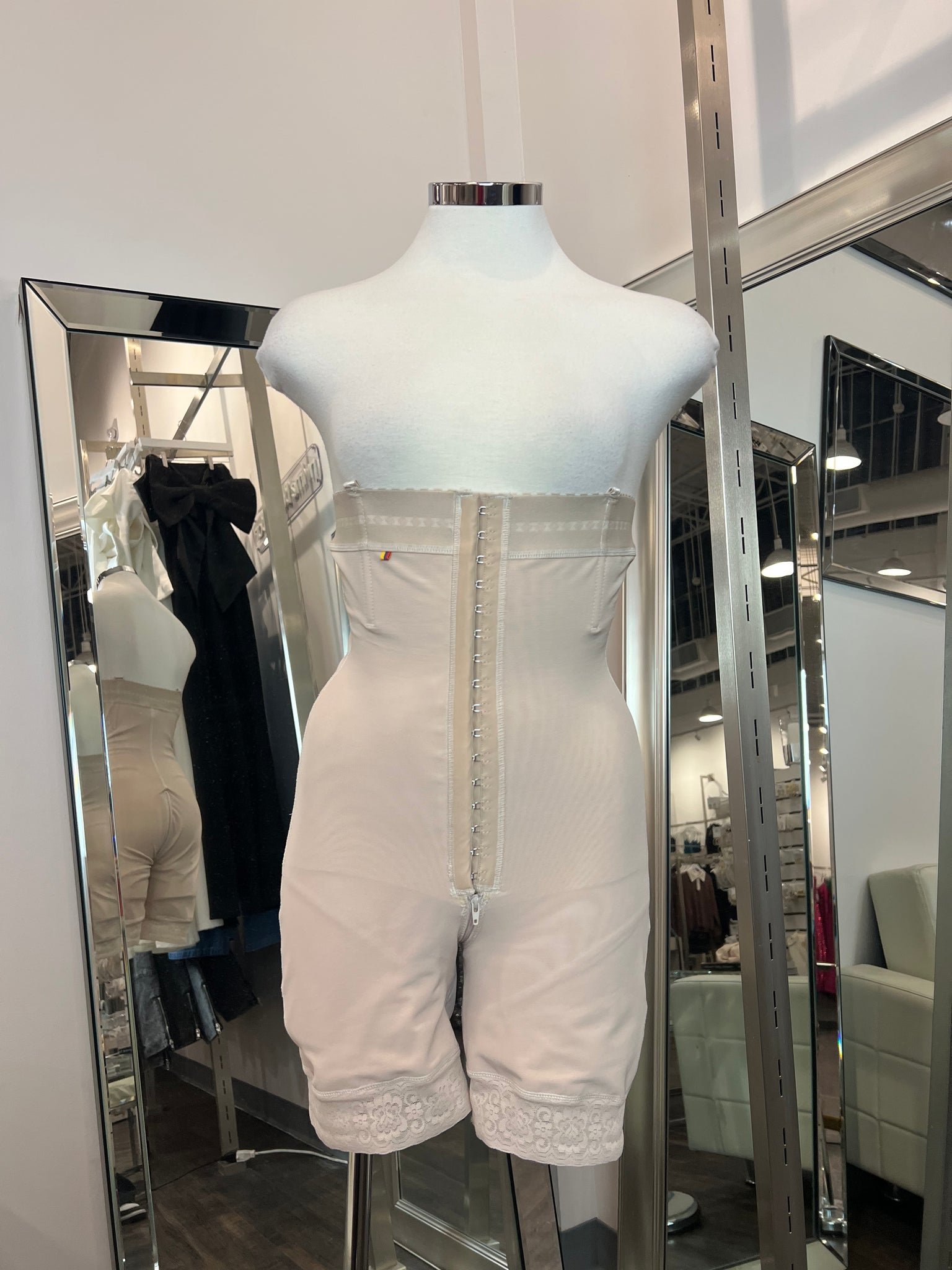 Triple-hook core compression settings, ultra high waist, removable straps, butt lifting, nd above knee length.